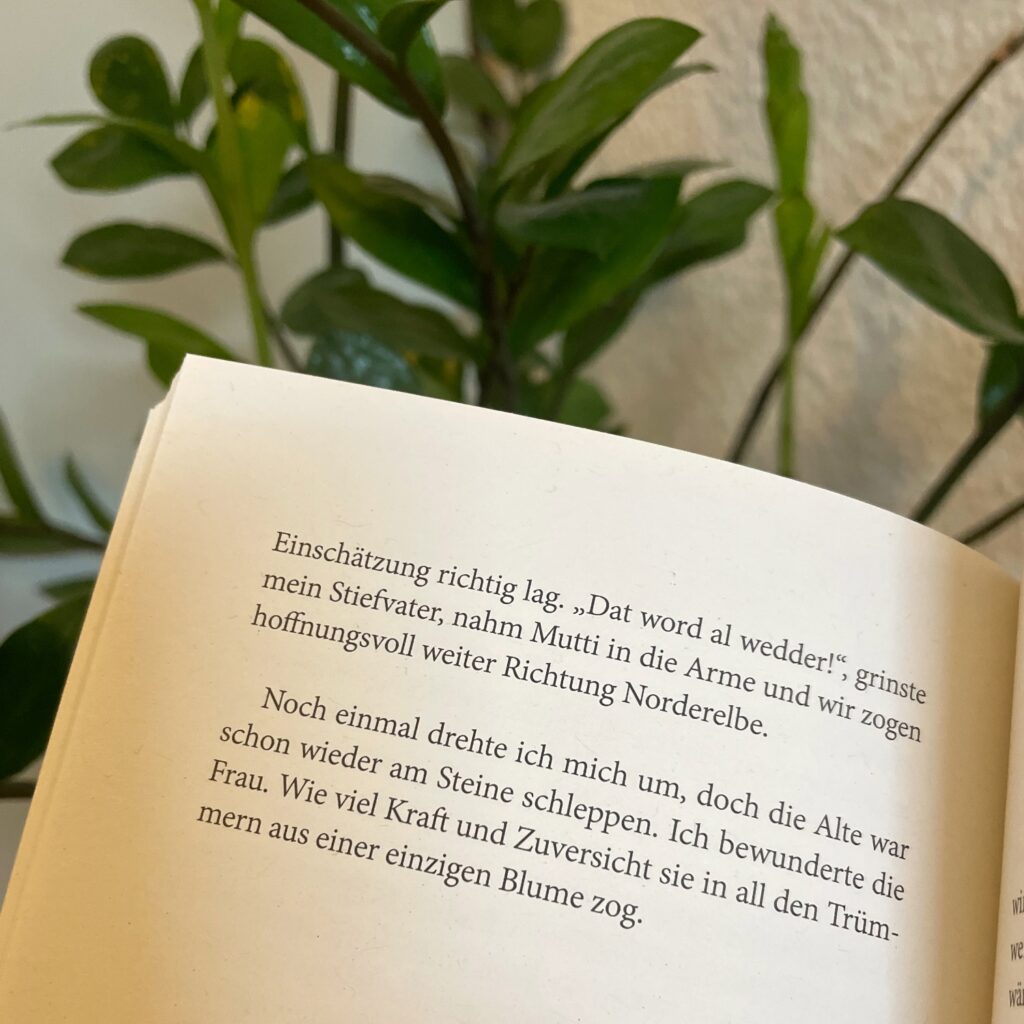 „Es waren diese Momente, in der diese noch so verstörend klingenden Sätze meine Liebe zu meiner Mutter in Bewunderung aufstiegen ließen. In ihr sah ich die bitternotwendige Hoffnung in all der Verzweiflung des Luftangriffes. Sei tapfer! Ihre Worte beim einstigen Abschied vom Hauptbahnhof waren es, an denen ich mich während der Kriegsjahre aufrichtete und die sich tief in mein Gedächtnis gebrannt haben. Unmerklich bewegten sich meine trockenen Lippen als sprächen sie diese Worte nach.“ (S. 24)